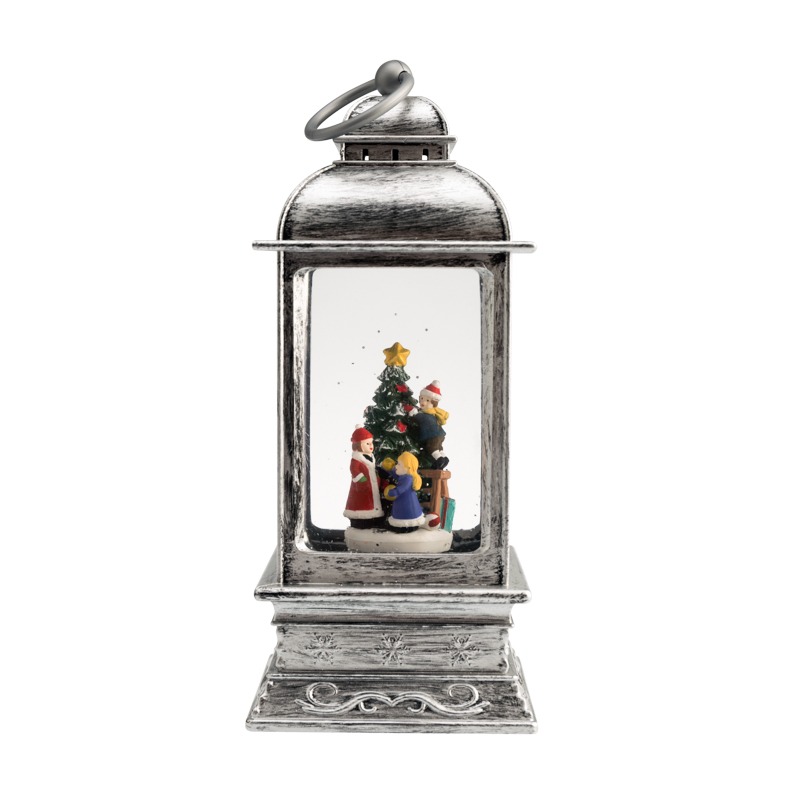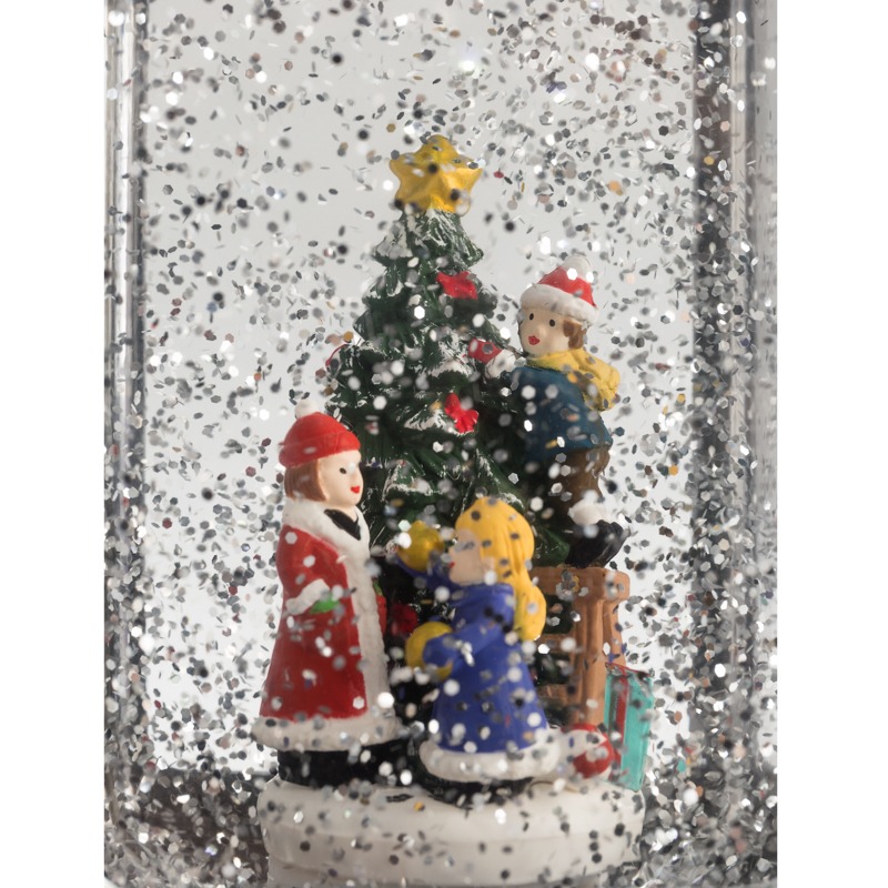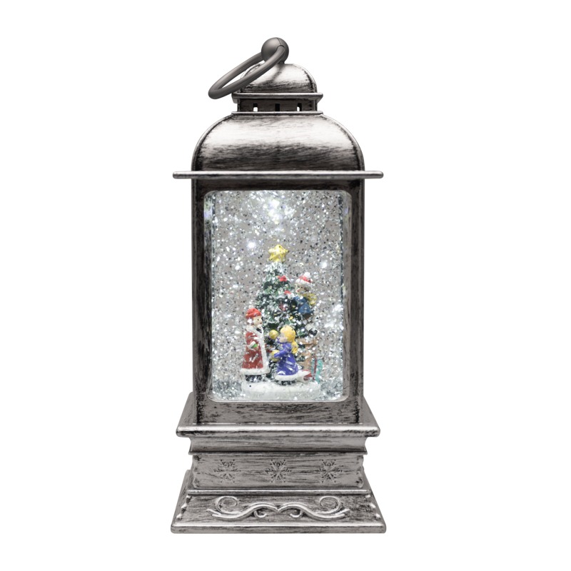 Декоративный фонарь «Рождество» — великолепное интерьерное украшение, символизирующее Новый год и Рождество. Светильник с эффектом снегопада и подсветкой выполнен в серебристом цвете, внутри находятся фигурки детей, наряжающих елку. Портативный фонарь питается от 4 батареек типа ААА или от сетевого блока через USB-шнур. Вьюга, создаваемая сверкающими блестками, кружится внутри колбы и подсвечивается белыми диодами. Декоративный фонарь станет прекрасным подарком детям и взрослым, принесет атмосферу зимней сказки в ваш дом.