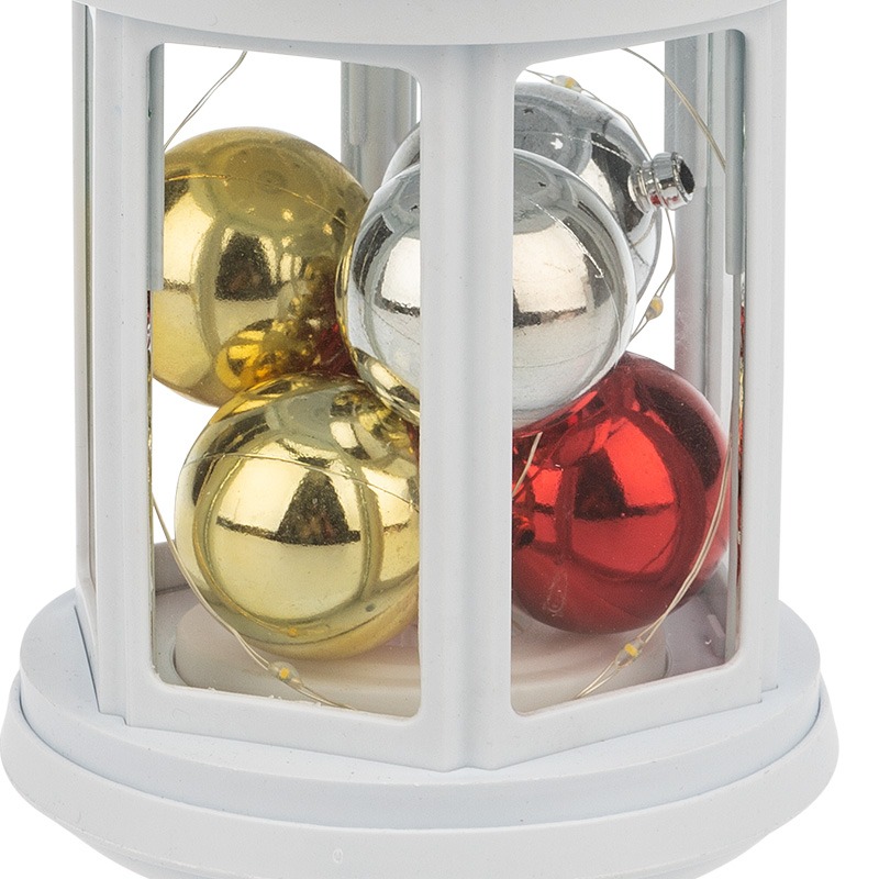 Декоративный фонарь представляет собой корпус белого цвета аутентичного исполнения, за стеклом находятся небольшие елочные шарики, подсвечиваемые диодной мини-гирляндой. 12 диодов излучают теплый белый свет и питаются от 2 батареек типа АА. Металлизированная глянцевая поверхность шариков эффектно играет в световом потоке, отбрасывая яркие блики на окружающие предметы. Светодиоды экономичны, безопасны и долговечны. Фонарь с шариками станет великолепным украшением праздничного и повседневного интерьера.
