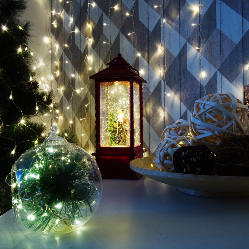 Декоративный фонарь с эффектом снегопада и подсветкой NEON-NIGHT «Дед Мороз» является оригинальным интерьерным украшением. Корпус светильника выполнен из прочного гипоаллергенного ABS-пластика. Внутри колбы из прозрачного стекла, заполненной специальной жидкостью, размещены декоративные фигурки ели и Деда Мороза. В основании фонаря установлен специальный компрессор: при включении изделия он начинает разгонять жидкость, создавая вихрь серебристых блесток. Композиция подсвечивается 2 долговечными яркими диодами теплого белого оттенка. Фонарь работает от 4 мизинчиковых батареек типа AAA (не входят в комплект), что обеспечивает его автономность и предоставляет возможность размещать в любом удобном месте. В комплекте предусмотрен USB-кабель для альтернативного подключения. Клавиша ON/OFF расположена в основании корпуса. Если конфетти кружатся недостаточно активно, стоит встряхнуть фонарь: блестки могут забиваться в компрессор и препятствовать нормальному потоку жидкости.