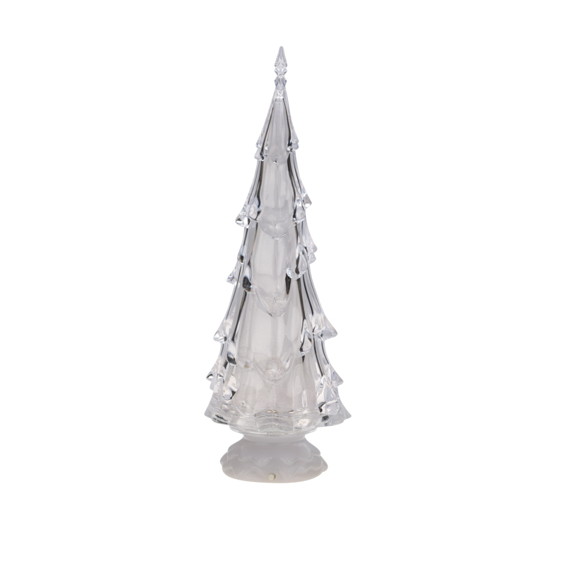 Материал изготовления – прочный прозрачный пластик. В нижней части устойчивой подставки располагается батарейный блок для 4 элементов питания типа ААА, а также удобная клавиша включения/выключения подсветки. Елочка питается как от батареек, так и от сети: на боковой части корпуса находится DC- и USB-разъем.