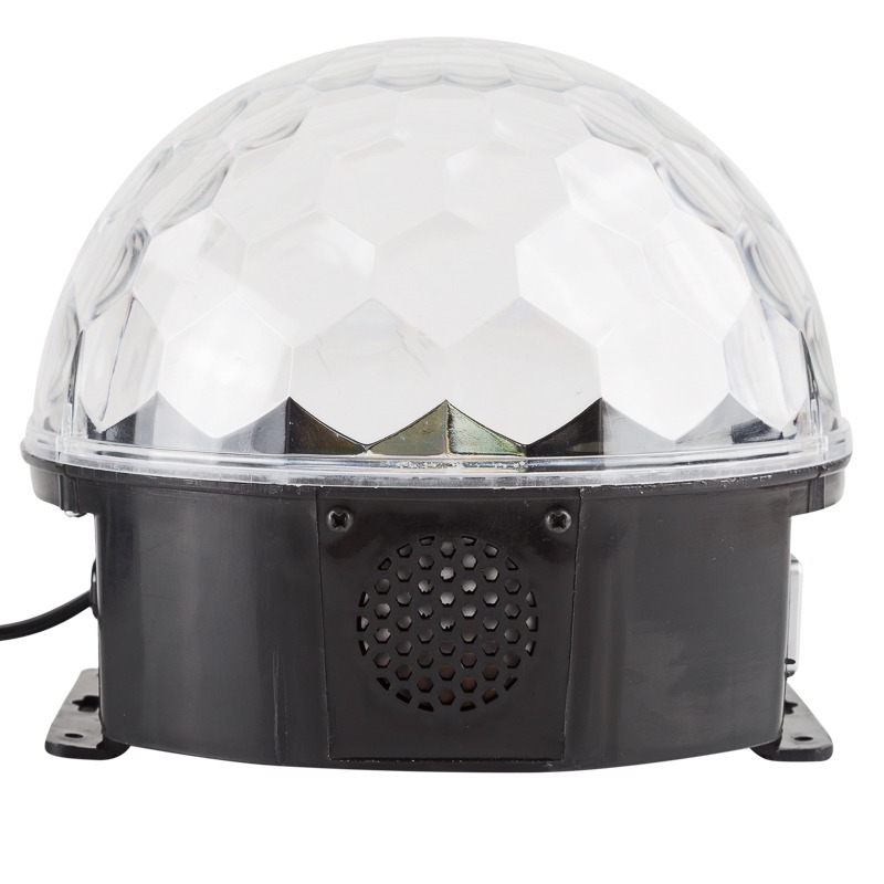 Светодиодная система «Диско-шар» с пультом дистанционного управления и функцией сопряжения через Bluetooth — уникальное устройство для создания эффекта светомузыки, которое поможет организовать веселую вечеринку в любом месте, где есть электрическая розетка. 6 ярких диодов RGB светятся разными цветами, а вращающийся купол разносит задорные блики. Диско-шар умеет подстраиваться под ритм звучащей музыки благодаря встроенному датчику. Можно воспроизводить треки прямо с устройства через USB-флешку. Изделие устанавливается на поверхности или монтируется на стену, потолок.