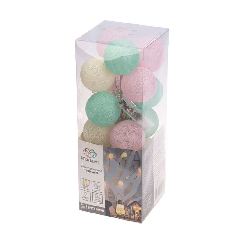 Тайские фонарики Перламутр 3.5 м, 20 LED, прозрачный ПВХ, цвет свечения теплый белый NEON-NIGHT
