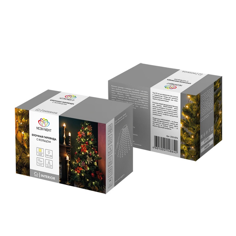Елочная гирлянда с кольцом и 7 нитями по 1,5 м — готовое решение для быстрого и эффектного декорирования новогодней ели. Конструкция изделия представляет собой кольцо, к которому на равных промежутках крепятся 7 нитей с диодами, излучающими белый свет теплого оттенка — всего 105 светодиодов. Провод помещен в изоляционную оболочку из гибкого ПВХ темно-зеленого цвета и отлично маскируется в кроне классических елок. Гирлянда предназначена для домашнего использования. Чтобы нарядить ель, достаточно надеть кольцо на вершину и распределить нити. Для управления подсветкой предусмотрен контроллер с 8 режимами. Длина питающего шнура — 3 метра.