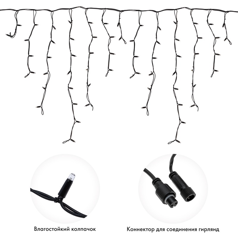 Гирлянда Айсикл (Бахрома) представляет собой гибкий горизонтальный шнур-шину, к которому через определенные промежутки крепятся вертикальные нити разной длины со светодиодами. <br> Гирлянда имитирует сосульки и может послужить оригинальным решением при украшении карнизов, арок, фасадов зданий, витрин магазинов, а также стать эффектным элементом декора внутри помещений.<br> Благодаря использованию светодиодов отличительной особенностью гирлянды является превосходная яркость и низкое энергопотребление.<br> При длине 3,2 м гибкая направляющая имеет 24 вертикальные нити от 20 до 90 см.<br> Наличие мерцающего эффекта привлекает внимание и значительно преображает украшенную поверхность (мерцает каждый пятый светодиод).<br> Данная гирлянда имеет теплый белый цвет свечения и предназначена для использования как внутри помещений, так и снаружи.<br> Важной особенностью данного исполнения является каучуковый провод, благодаря которому гирлянда отличается высокой надежностью и может быть использована в условиях российского климата, даже в самых холодных регионах страны!