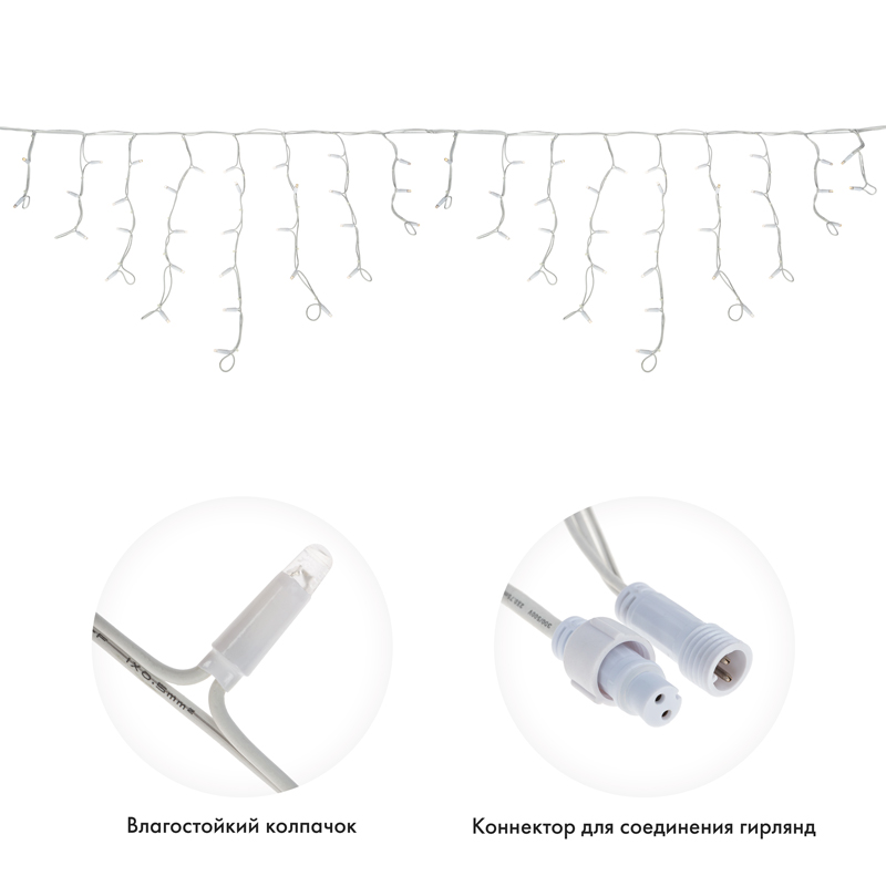 Гирлянда имеет белый цвет свечения и предназначена для использования как внутри помещений, так и снаружи.