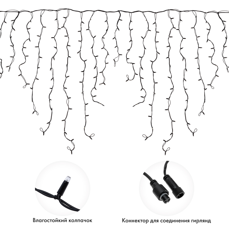При подключении дюралайта к соединительному разъему (муфте) необходимо заизолировать свободное воздушное пространство соединительного разъема (муфты) морозостойким силиконовым герметиком, предотвращающим попадание влаги. Сверху данного соединения необходимо использовать термоусаживаемую трубку. Светодиодная гирлянда Занавес (Дождь) представляет собой гибкий горизонтальный шнур-шину 2 м, к которому через определенные промежутки крепятся вертикальные нити равной длины со светодиодами.
