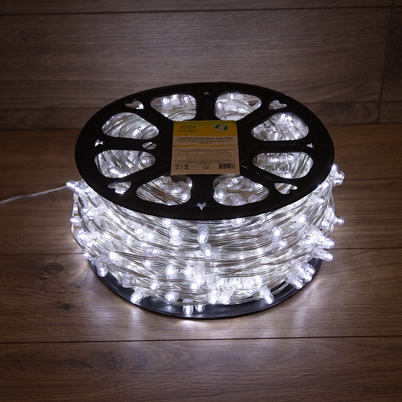 Данная гирлянда поставляется в бухтах по 100 м на прозрачном ПВХ, представлена в белом цвете свечения светодиодов.
