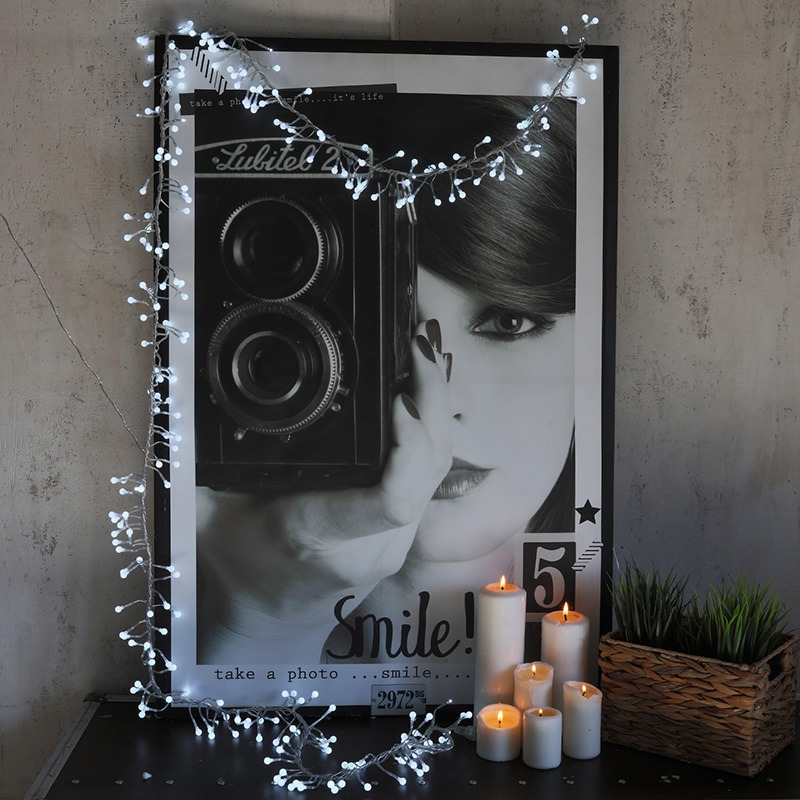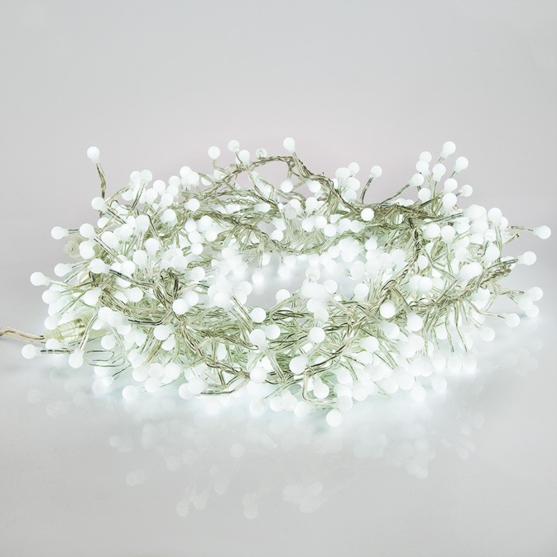 Гирлянда «Мишура» длиной 3 метра выполнена в виде объемной пушистой елочной мишуры. На концах многочисленных отводов расположены пластиковые шарики диаметром 1 см, внутри которых находятся светодиоды. Всего в изделии 288 диодов, излучающих белый свет нейтрального оттенка. Серебристый провод покрыт изоляцией из прозрачного ПВХ. Есть возможность собрать украшение длиной до 60 метров, соединив несколько гирлянд при помощи удобного разъема. Для подключения к электросети предусмотрен трехметровый кабель с контроллером. Устройство управления имеет 8 предустановленных режимов свечения с разной динамикой.