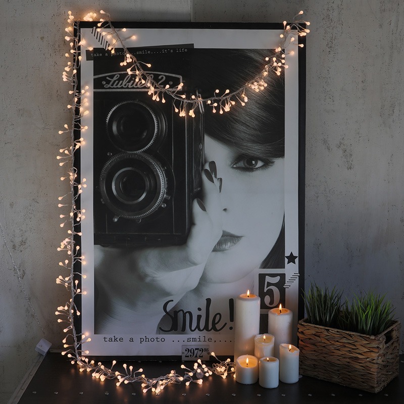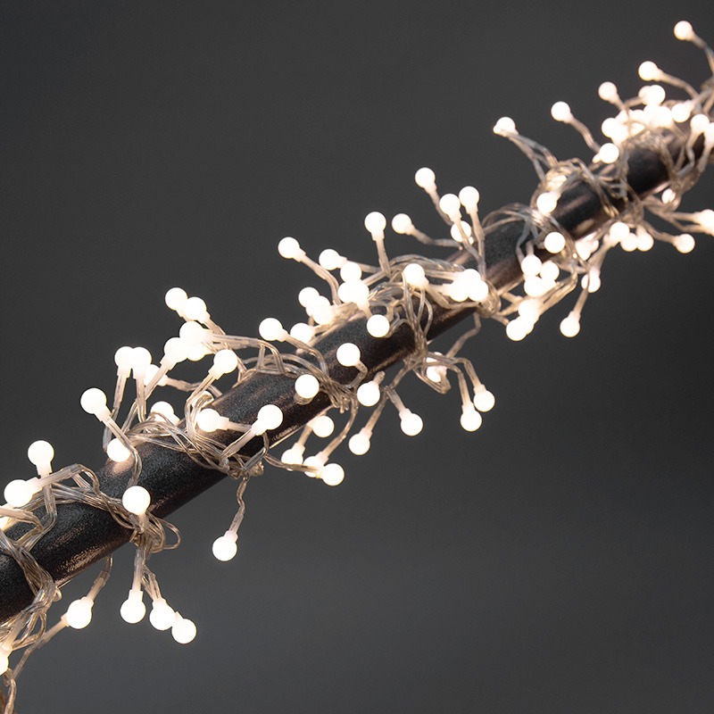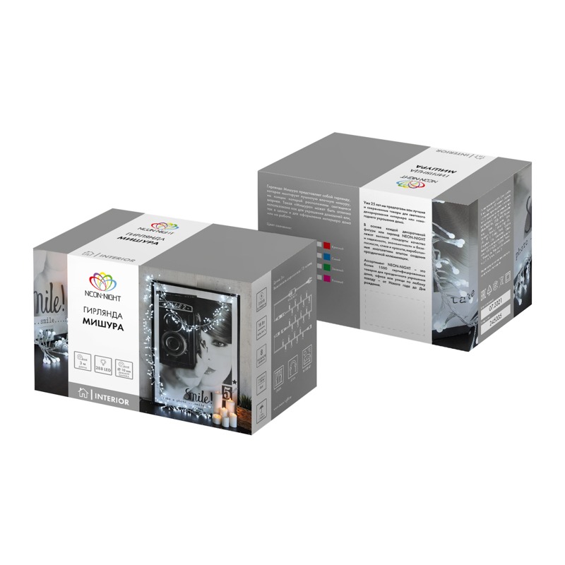 Гирлянда «Мишура» длиной 3 метра состоит из кабеля в прозрачной ПВХ-оболочке и 288 экономичных диодов, излучающих белый свет теплого оттенка. Объемное украшение с общим диаметром 9 см имитирует пушистую елочную мишуру, мерцающую золотистыми огнями. Гирлянда подходит не только для украшения новогодней ели, но и для создания акцентной интерьерной подсветки. Диоды управляются контроллером, меняющим сценарии свечения — всего 8 разных режимов. Степень защиты IP20 предполагает домашнее использование. Для подключения в сеть 230 В предусмотрен трехметровый питающий шнур.