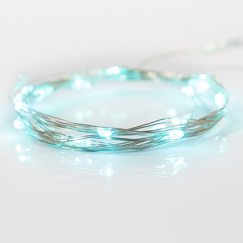 Гирлянда «Роса» длиной 2 метра — мобильное светодиодное украшение, питающееся от двух батареек CR2032. Блок для элементов питания располагается на конце электрического кабеля. Гирлянду можно использовать для оформления любых интерьерных объектов. 20 диодов светятся бирюзовыми огнями, работают до 48 часов от двух элементов питания и практически не нагреваются. Безопасное украшение прекрасно подходит для декора ваз, оконного текстиля, цветочных букетов, уличных растений, оформления детских комнат.
