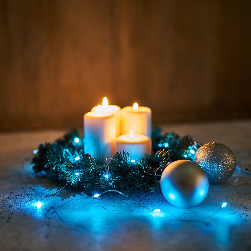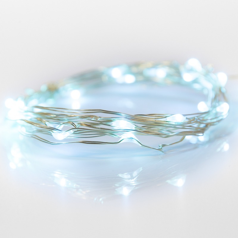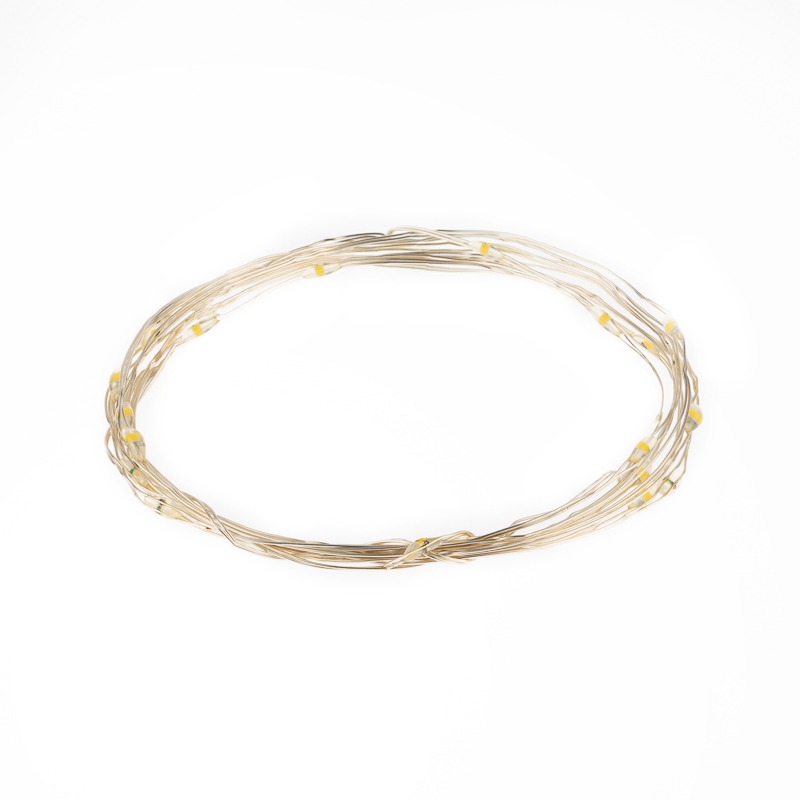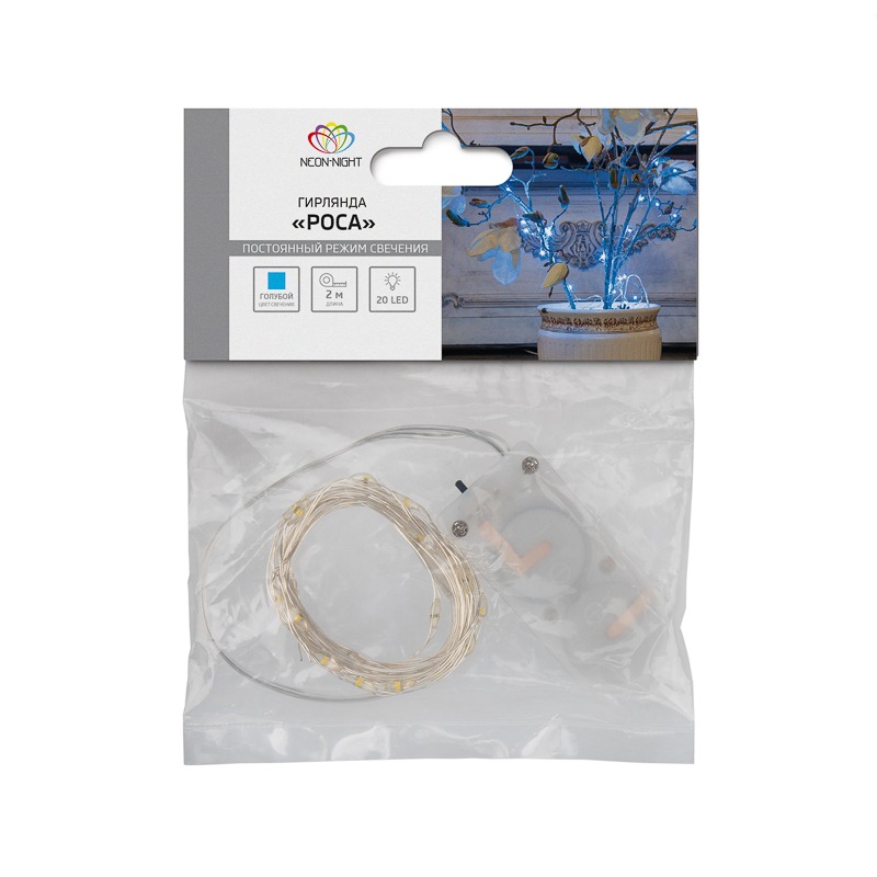 Гирлянда «Роса» длиной 2 метра питается от двух батареек типа CR2032, которые идут в комплекте поставки. Независимость от электросети дает большие возможности в создании уникального декора: изделие подходит для украшения различных интерьерных предметов, композиций и даже букетов из цветов. 20 диодов, расположенных на серебристом проводе светятся голубым. Гирлянда, подобно проволоке, имеет свойство фиксироваться в выбранном положении. Блок с батарейками находится на конце электрокабеля длиной 30 см. Изделие на батарейках, оно безопасно в использовании и подойдет для декора даже в детской комнате.