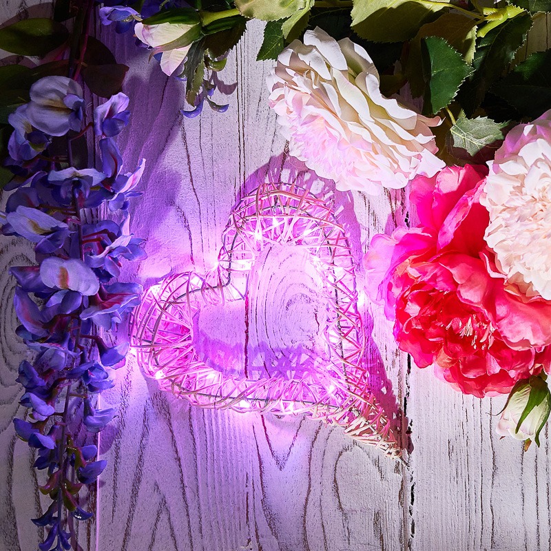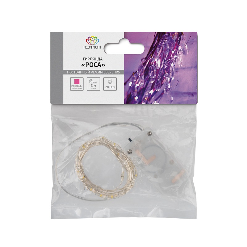 Гирлянда «Роса» длиной 2 метра состоит из серебристого шнура, 20 диодов розового свечения и батарейного блока, размещенного на конце 30-сантиметрового провода. Две батарейки CR2032 входят в комплект поставки. Элементов питания хватает на 48 часов непрерывного свечения. Провод сохраняет форму изгиба, что дает большие возможности в оформлении интерьерных и экстерьерных объектов. Изделия на батарейках совершенно безопасны в использовании.