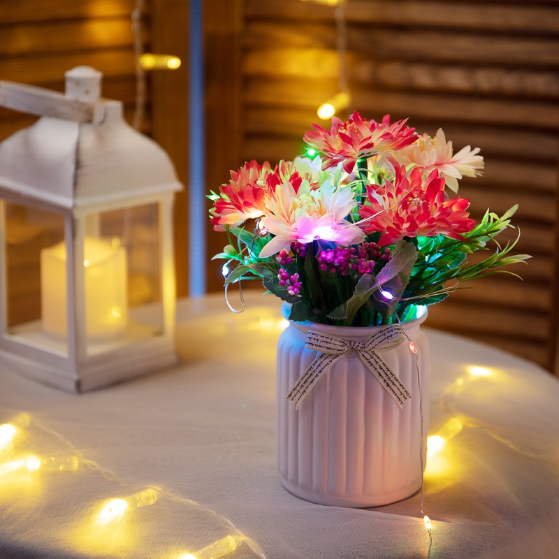 Гирлянда состоит из тонкого провода длиной 2 метра, с расположенным на нем 20 разноцветными долговечными светодиодами.
