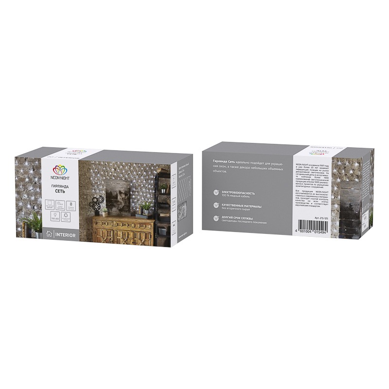 Гирлянда «Сеть» 1,5×1,5 м прекрасно подходит для декора оконных проемов. 96 светодиодов, излучающих ровный белый свет, расположены на одинаковом расстоянии. Воздушная сетка, в основе которой находится провод с прозрачной оболочкой из ПВХ, можно крепить при помощи крючков на присоске. Диапазон рабочих температур и защита IP20 предполагают использование в сухих отапливаемых помещениях. Контроллер с 8 режимами управляет красивыми динамическими эффектами.