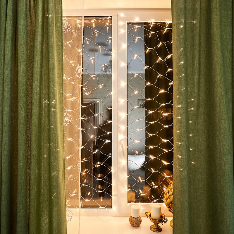 Гирлянда «Сеть» 1,8×1,5 м с защитой IP20 предназначена для использования в квартире, доме, офисе и других отапливаемых помещениях с нормальной влажностью. Гирлянда представляет собой воздушное полотно с крупными ячейками, выполненное из провода с прозрачной ПВХ-изоляцией. 180 экономичных светодиодов излучают яркий белый свет теплого оттенка. Для установки изделия удобно использовать присоски с крючками. Для подключения к электросети предусмотрен трехметровый кабель. Светодинамические эффекты переключаются при помощи контроллера — всего 8 режимов.