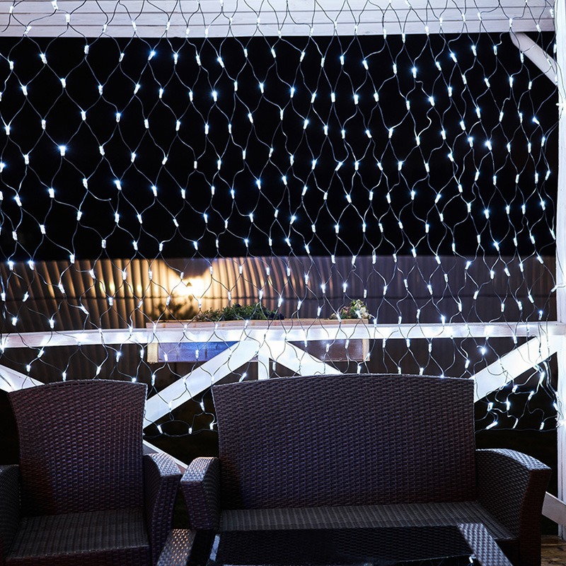 Гирлянда-сеть представляет из себя конструкцию в виде прямоугольника размером 2,5*2,5 метра, разбитого на равные ромбы, в углах которых находятся диоды белого цвета. Гирлянда имеет степень влагозащиты IP44 и ПВХ провод черного цвета, что позволит вам быстро и выгодно решить вопрос с декоративным украшением любых объектов как внутри помещения, так и снаружи. В комплекте идет контроллер с 8 режимами свечения, что позволяет гирлянде работать в динамике. Данная гирлянда используется для украшения фасадов и потолков зданий практически любой площади, отлично подходит для украшения небольших кустов, растяжки между направляющими в беседке или веранде, ей можно легко и быстро обмотать колонны или столбы, служит красивым декором окон зданий. Гирлянда-сеть имеет самое лучшее отношение цены к площади декорирования относительно других гирлянд, что делает ее уникальной в своем роде.