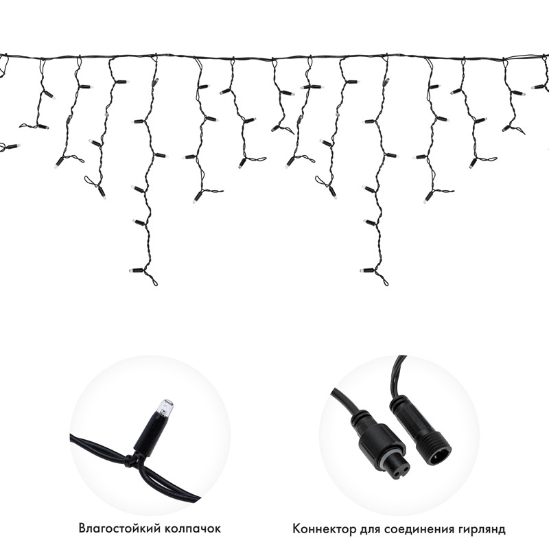 Гирлянда Айсикл (Бахрома) представляет собой гибкий горизонтальный шнур-шину, к которому через определенные промежутки крепятся вертикальные нити разной длины со светодиодами. <br> Гирлянда имитирует сосульки и может послужить оригинальным решением при украшении карнизов, арок, фасадов зданий, витрин магазинов, а также стать эффектным элементом декора внутри помещений.<br> Благодаря использованию светодиодов отличительной особенностью гирлянды является превосходная яркость и низкое энергопотребление.<br> При длине 4 м гибкая направляющая имеет 32 вертикальные нити от 20 до 60 см. <br> Наличие мерцающего эффекта привлекает внимание и значительно преображает украшенную поверхность (мерцает каждый пятый светодиод).<br> Данная гирлянда имеет теплый белый цвет свечения и предназначена для использования как внутри помещений, так и снаружи.<br> Важной особенностью данного исполнения является каучуковый провод, благодаря которому гирлянда отличается высокой надежностью и может быть использована в условиях российского климата, даже в самых холодных регионах страны!