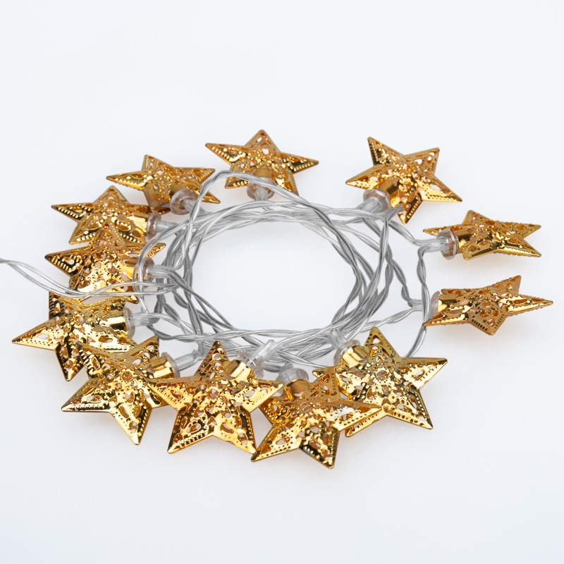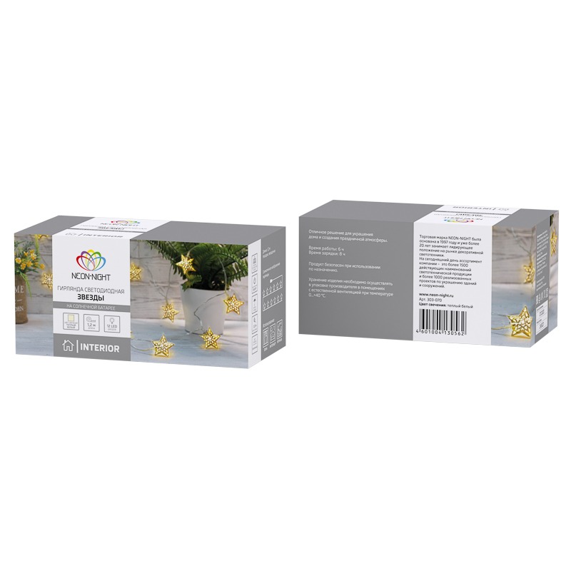 Светодиодная гирлянда «Звезды» питается от солнечной батареи. На проводе, помещенном в прозрачную изоляцию из ПВХ, находятся 12 диодов, которые выполнены в виде ажурных звезд золотистого цвета с глянцевым покрытием. Экономичные безопасные диоды излучают белый свет теплого оттенка. На питающем элементе предусмотрен блок управления с клавишей включения, выключения и смены режима на динамичный — удобное решение, когда гирлянда не используется. Защита IP44 допускает использование на улице.