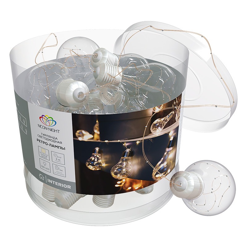 Гирлянда «Ретро-лампы» длиной 3 метра — это оригинальный световой декор, который гармонично украсит интерьер, подчеркнет уникальный вкус и креативный подход к оформлению помещений. На тонком серебристом проводе находятся 100 ярких диодов, излучающих теплый белый свет. 10 насадок, выполненных в виде классических лампочек накаливания, расположены на расстоянии 30 см друг от друга и мягко подсвечиваются диодами изнутри. Гирлянда питается от 3 батареек типа АА и имеет кнопку ON/OFF на батарейном блоке. Изделие рассчитано на использование в интерьере, в том числе и в детских комнатах благодаря абсолютной безопасности.