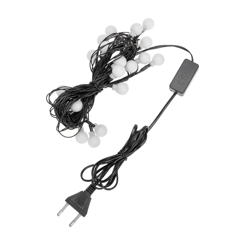 Светодиодная гирлянда Шарики длиной 5 метров выполнена в виде прозрачного ПВХ шнура с матовыми круглыми насадками, которые светятся разными цветами. Всего в гирлянде 20 светодиодов. <br> Экономичные светодиоды не перегорают со временем и не нагреваются, поэтому украшение будет долгое время радовать своих обладателей. <br> Изделие предполагает размещение внутри сухих отапливаемых помещений. Гирлянда питается от электросети с напряжением до 230 Вольт.