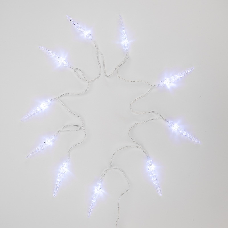 Светодиодная гирлянда «Сосульки» длиной 1,5 метра украшена пластиковыми насадками в виде ледяных сосулек, которые ярко подсвечиваются диодами. Украшение способствует созданию магической атмосферы праздника и помогает эффектно оформить интерьер. 10 сосулек расположены на расстоянии 16 сантиметров друг от друга, в качестве основы используется электрический кабель в надежной изоляции из прозрачного ПВХ. Диоды белого свечения питаются от двух батареек АА, которые помещаются в небольшой блок на конце кабеля. Безопасное изделие на батарейках — прекрасный вариант для оформления детской комнаты.