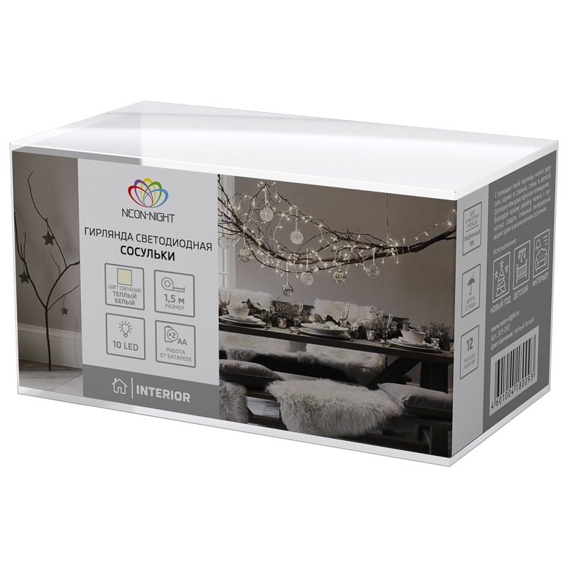 Светодиодная гирлянда «Сосульки» длиной 1,5 метра — идеальное решение для создания праздничного декора в преддверии Нового года. 10 насадок в виде сосулек ярко подсвечиваются диодами, которые излучают теплый белый свет. Необычный дизайн, тематическое исполнение, независимость от электрической сети и абсолютная безопасность открывают большие возможности в оформлении интерьера. Гирлянда питается от двух элементов типа АА, для которых предусмотрен отдельный блок с крышкой и клавишей ON/OFF. Изделие IP20 предназначено для использования дома, в офисе, магазине и других помещениях со стандартными условиями.