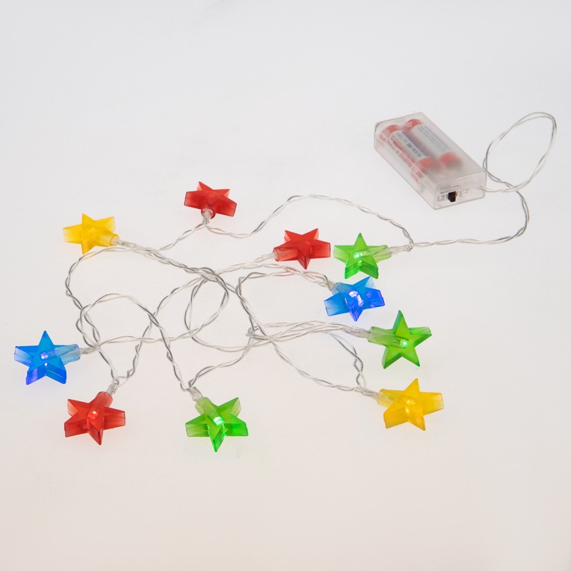 Светодиодная гирлянда «Звездочки» длиной 1,5 — оригинальное и эффектное украшение, которое подойдет для оформления как новогодней ели, так и отдельных предметов интерьера: гардин, ваз, скульптур, элементов мебели. Насадки, в виде матовых разноцветных звездочек, расположены по всей длине провода и подсвечиваются 10 разноцветными диодами, питающимися от двух батареек типа АА. Гирлянда выполняет роль акцентной подсветки в отапливаемых помещениях со стандартными условиями влажности и температуры.