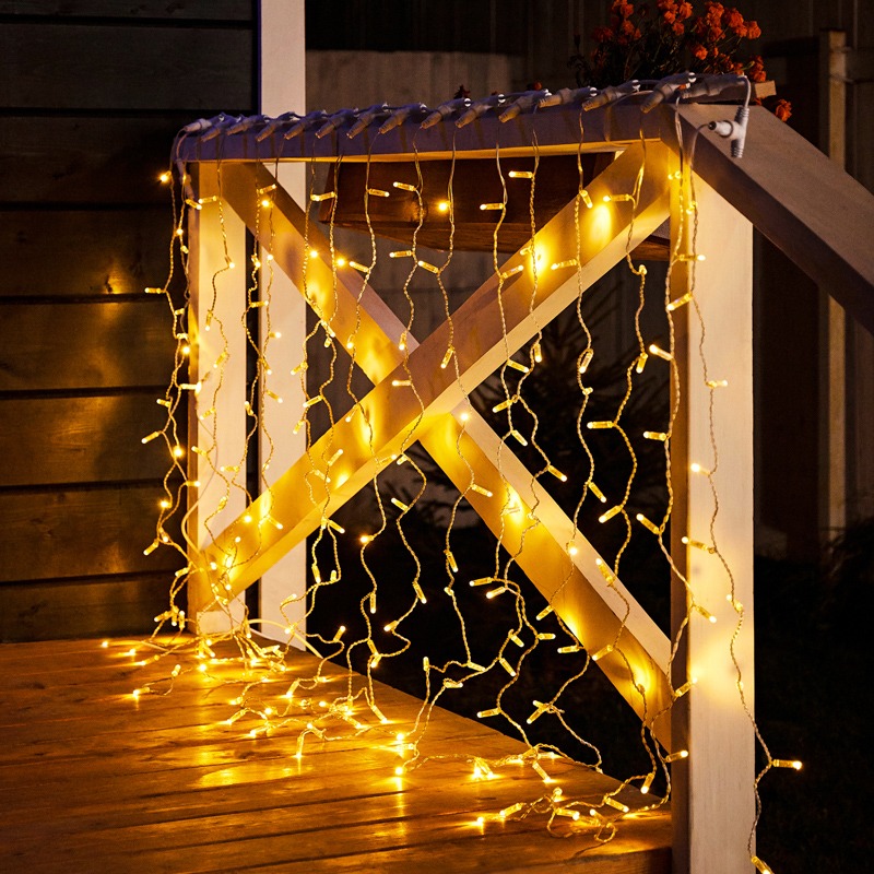 Гирлянда "Светодиодный Дождь" представляет собой гибкий горизонтальный шнур-шину (2м), к которому через определенные промежутки крепятся вертикальные нити (16 шт.) со светодиодными лампами, которые отличаются от «Бахромы» тем, что имеют одинаковую, достаточно значительную длину, часто превышающую протяженность шины. На концах каждой шины есть разъем и штепсель, которые предназначены для последовательного соединения нескольких световых дождей в большой занавес ПЛЕЙ-ЛАЙТ. Используя занавес, можно не только создавать красивые световые занавесы или оформлять различные плоскости, например, фасады домов, окна и т.д., но и украшать объемные объекты.