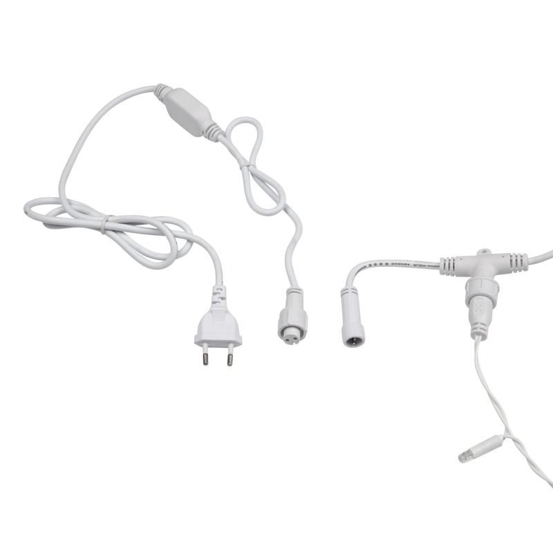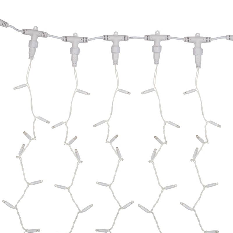 Гирлянда "Светодиодный Дождь" представляет собой гибкий горизонтальный шнур-шину (2м), к которому через определенные промежутки крепятся вертикальные нити (20 шт.) со светодиодными лампами, которые отличаются от «Бахромы» тем, что имеют одинаковую, достаточно значительную длину, часто превышающую протяженность шины. На концах каждой шины есть разъем и штепсель, которые предназначены для последовательного соединения нескольких световых дождей в большой занавес ПЛЕЙ-ЛАЙТ. Используя занавес, можно не только создавать красивые световые занавесы или оформлять различные плоскости, например, фасады домов, окна и т.д., но и украшать объемные объекты.