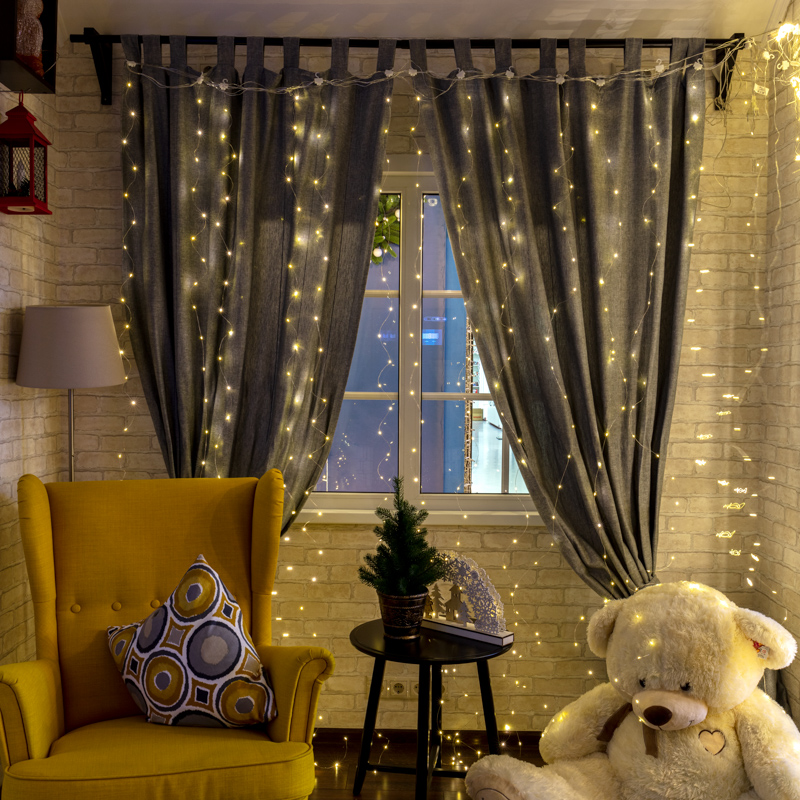При использовании на окнах или других поверхностях гирлянда позволяет осуществить равномерную засветку по всей площади, для этого достаточно ее растянуть по периметру, используя, например, присоски с крючком.