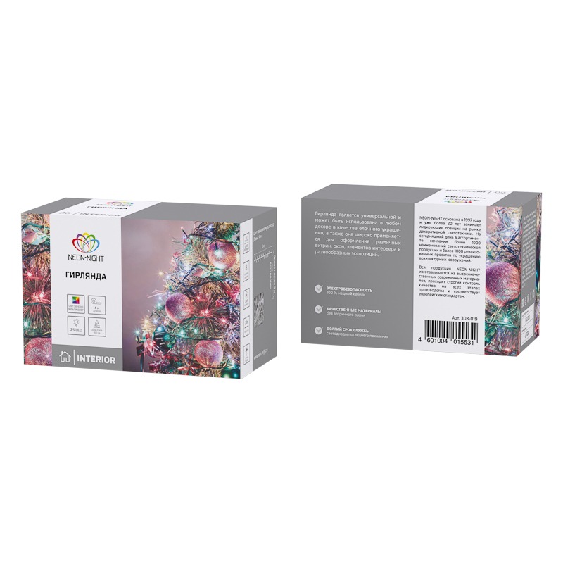 Гирлянда «Твинкл» длиной 4 метра представляет собой провод, изолированный темно-зеленым ПВХ, на котором расположены 25 диодов. Гирлянда цвета «мультиколор» станет прекрасным украшением новогодней ели, а также эффектно подчеркнет другие предметы обстановки: портьеры, вазы, торшеры, лестничные перила, элементы мебели. Светодиоды переливаются яркими разноцветными огнями, создавая ощущение сказки и преображая все вокруг. Гирлянда подключается к розетке при помощи 3-метрового шнура с вилкой. Контроллер с 8 режимами позволяет менять светодинамику в соответствии с настроением.