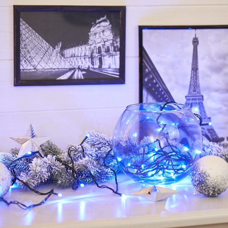 Гирлянда «Твинкл» длиной 4 метра подходит для создания любого интерьерного декора, самый удачный вариант — украшение новогодней ели. Изделие рассчитано на использование в сухих отапливаемых помещениях. Изоляционная оболочка из темно-зеленого ПВХ надежно защищает конструкцию от повреждения из-за перегибов. 25 светодиодов переливаются синими огнями, экономично расходуя энергоресурс и управляются контроллером. Устройство имеет 8 разных режимов, включая постоянное свечение. Питающий шнур длиной 8 метров позволяет разместить гирлянду в любом удобном месте.