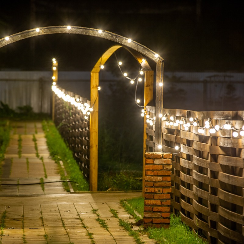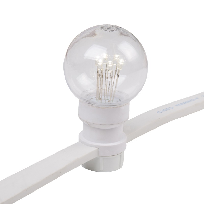 Специально подготовленный комплект LED Galaxy Bulb String состоит из гирлянды Belt Light длиной 10 м и 30 светодиодных ламп с диаметром 45 мм. Миниатюрные лампочки, уже установленные в патроны, излучают белый свет нейтрального оттенка в постоянном режиме. Электрический кабель с плоским сечением помещен в изоляционную оболочку из белого каучука. Полимер характеризуется гибкостью, прочностью, морозоустойчивостью — не теряет свои свойства при температуре до –40 °С. Защита по стандарту IP65 предполагает использование гирлянды как в помещениях, так и на улице.