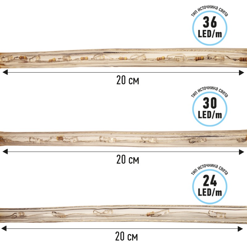 Дюралайт – гибкий световой шнур выполненный из ПВХ-трубки с токопроводящими жилами и светодиодами внутри. Используется для декоративной и архитектурной подсветки объектов. Шнур с двумя проводами внутри называется фиксинг, такой дюралайт используется в режиме постоянного свечения. Дюралайт с тремя и более жилами питания называется чейзинг, светодиоды в чейзинге подключены поочередно к разным жилам, при использовании контроллера это позволяет создавать эффект «бегущей волны» из поочередно загорающихся светодиодов (режим свечения с динамикой). Дюралайт поставляется в бухтах длинами до 100 м, в зависимости от модификации дюралайта модуль резки может составлять от 1 до 6 метров, следуя несложной инструкции потребитель легко может отрезать и подключить отрезок дюралайта нужной ему длины. Каждая бухта уже укомплектована 1 шнуром для подключения, максимальная подключаемая длина 100 м. Дополнительные шнуры можно приобрести отдельно арт. 124-011. Для работы в светодинамическом режиме необходим контроллер арт. 123-013. Температурный диапазон использования -40…+50 °С, монтаж при температуре выше 0 градусов. Дополнительно предлагаются контроллеры для дюралайта фиксинг и чейзинг мощностью от 24 до 340 Вт, что позволяет подключить в одну цепь до 140 метров.<br> При подключении дюралайта к соединительному разъему (муфте) необходимо заизолировать свободное воздушное пространство соединительного разъема (муфты) морозостойким силиконовым герметиком, предотвращающим попадание влаги. Сверху данного соединения необходимо использовать термоусаживаемую трубку.