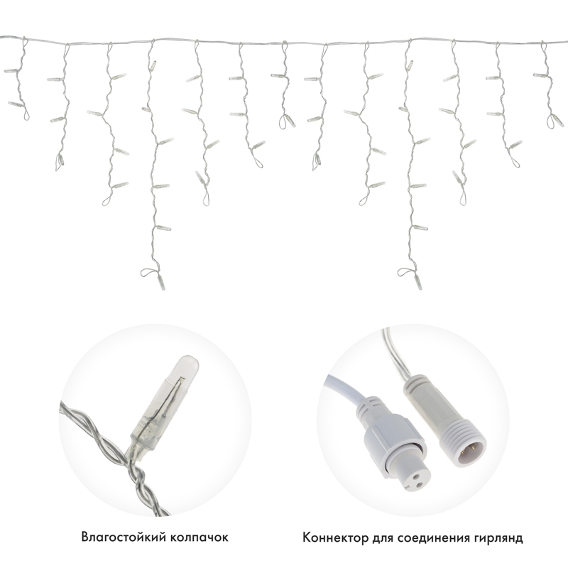 Гирлянда имитирует сосульки и может послужить оригинальным решением при украшении карнизов, арок, фасадов зданий, витрин магазинов, а также стать эффектным элементом декора внутри помещений.