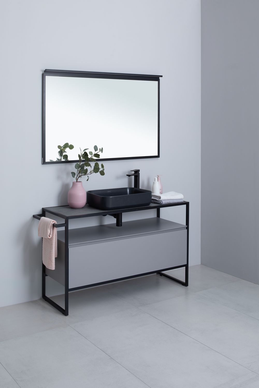 Стильные каркасы тумб и пеналов выполнены из металла, имеют брашированную поверхность с нанесением цвета путем анодирования.