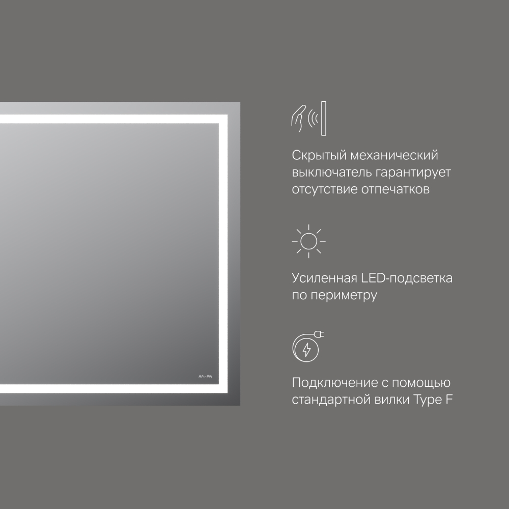 Скрытый механический выключатель сохраняет эстетическую целостность дизайна зеркала а также гарантирует отсутствие отпечатков пальцев на зеркальном полотне. Зеркальное полотно премиального качества производства Бельгии. Гарантия 3 года. ""
