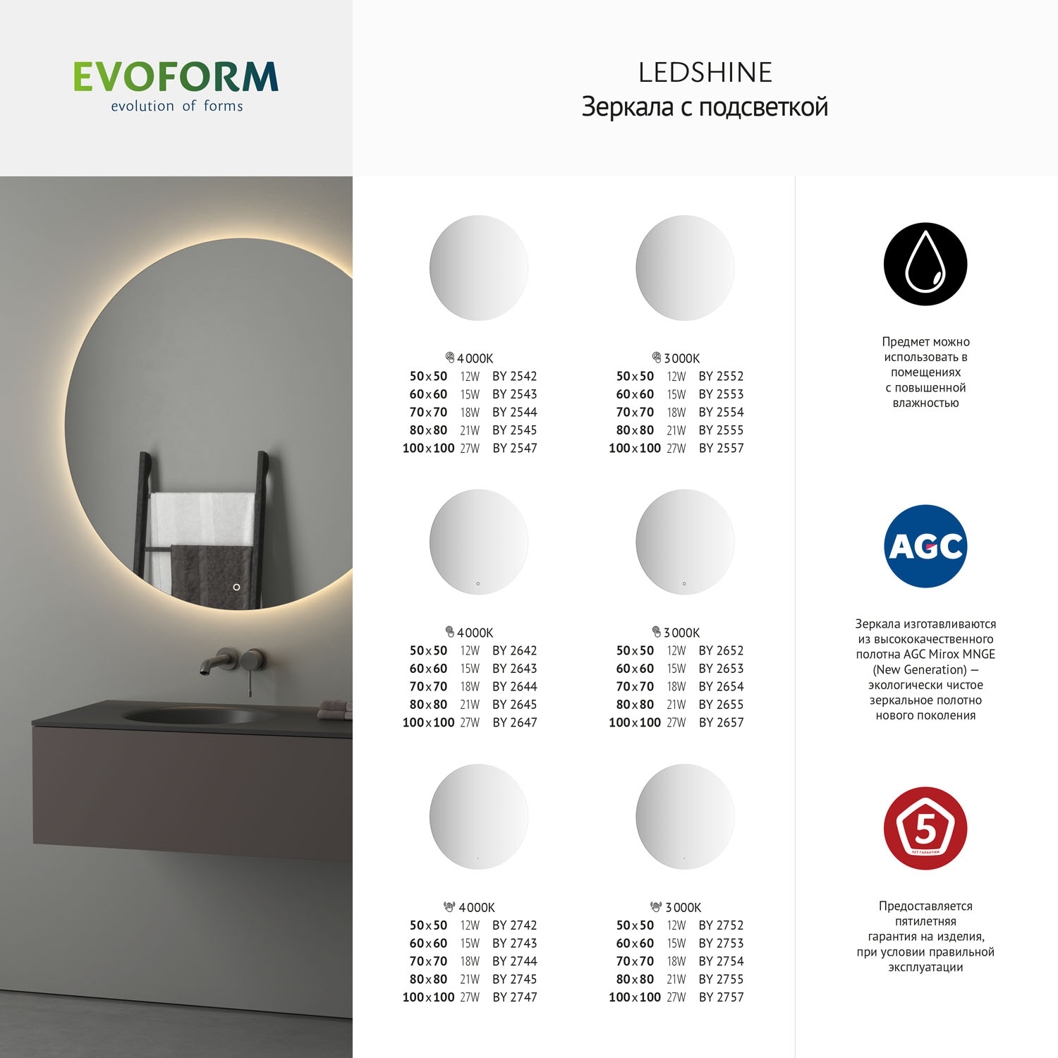 Зеркало с LED-подсветкой 12 W (D50 см) с сенсорным выключателем (теплый белый свет) торговой марки EVOFORM; Артикул: BY 2652; Вес нетто: 2,41 кг; Материал упаковки: картон; Стиль: современный; Монтаж: подвесной; Расположение зеркала: настенное; Крепление: винт-костыль; Материал: стекло; алюминий; пластик; Комплектация: инструкция, паспорт изделия, винт-костыль, дюбель; Торговая марка стекла: AGC Mirox MNGE — экологически чистое высококачественное зеркальное полотно нового поколения. Можно использовать в помещениях с повышенной влажностью; Форма зеркала: круг; Толщина полотна: 4 мм; Пятилетняя гарантия распространяется только на изделия,