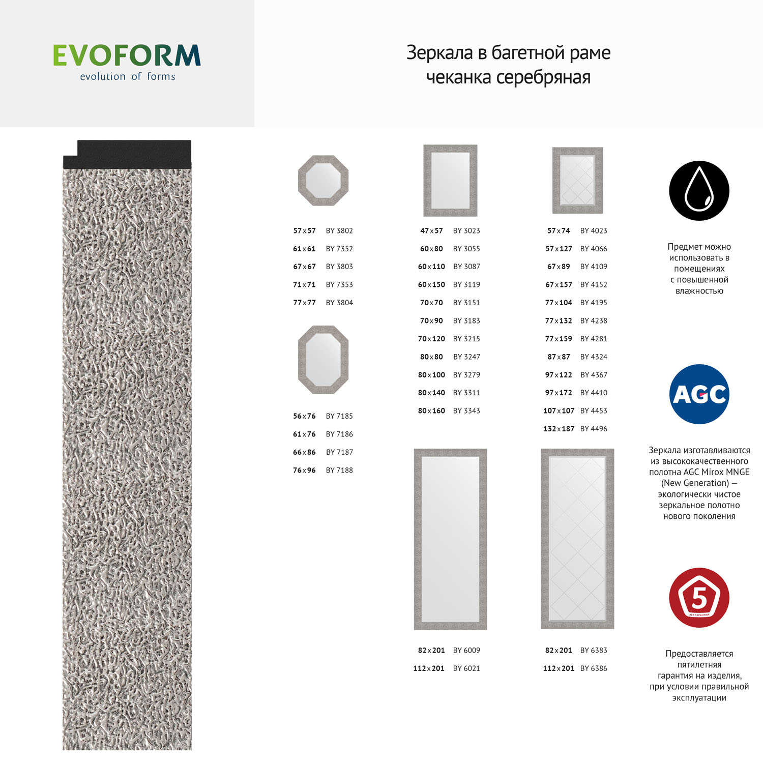 Артикул BY 7185: зеркало в багетной раме - чеканка серебряная 90 мм (56x76 см) торговой марки EVOFORM; Вес нетто (в кг): 3,701; Материал упаковки: Картон/Пленка; Монтаж: Настенный; Крепление в комплекте: Винт-костыль, дюбель; Материал: Стекло, пенополиуретан; Форма зеркала: Восьмиугольник; Толщина зеркального полотна (в мм): 4; Обработка кромки зеркального полотна: Шлифованная; Гарантия 5 лет при условии правильной эксплуатации; Не подлежит обязательной сертификации; Зеркала изготавливаются из высококачественного экологически чистого зеркального полотна нового поколения AGC Mirox MNGE (New Generation). Можно использовать в помещениях с повышенной влажностью.