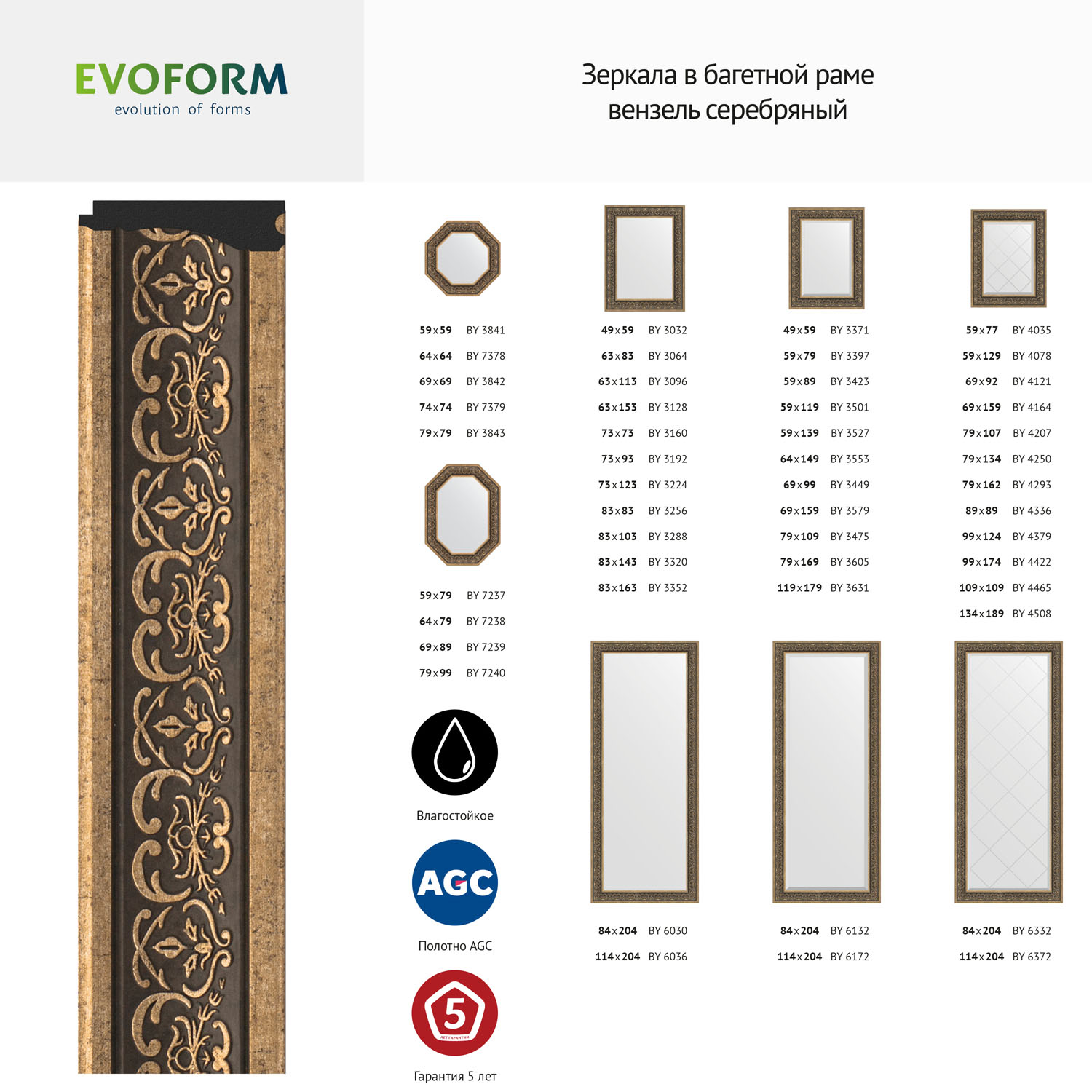 Артикул BY 7237: зеркало в багетной раме - вензель серебряный 101 мм (59x79 см) торговой марки EVOFORM; Вес нетто (в кг): 3,576; Материал упаковки: Картон/Пленка; Монтаж: Настенный; Крепление в комплекте: Винт-костыль, дюбель; Материал: Стекло, пенополиуретан; Форма зеркала: Восьмиугольник; Толщина зеркального полотна (в мм): 4; Обработка кромки зеркального полотна: Шлифованная; Гарантия 5 лет при условии правильной эксплуатации; Не подлежит обязательной сертификации; Зеркала изготавливаются из высококачественного экологически чистого зеркального полотна нового поколения AGC Mirox MNGE (New Generation). Можно использовать в помещениях с повышенной влажностью.
