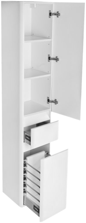 Шкаф-пенал Style Line Атлантика Люкс Plus 35 ЛС-00000694 с корзиной для белья, с распашной дверцей, с выдвижным ящиком. Предназначен для использования в ванных комнатах с повышенной влажностью. Подвижные механизмы оснащены доводчиками для плавного закрывания.