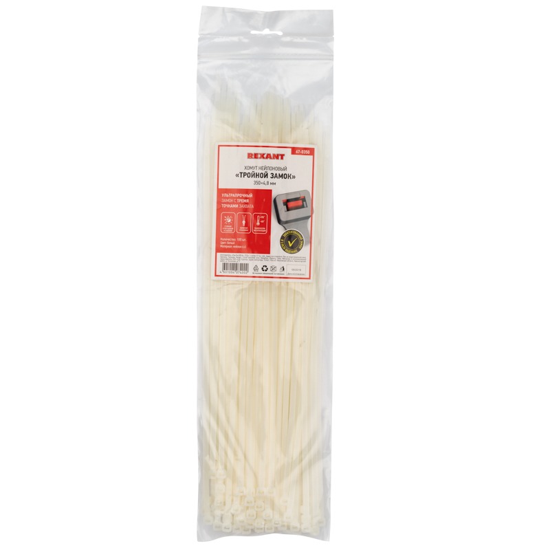 Хомут-стяжка нейлоновая с тройным замком 350x4,8мм, белая (100 шт/уп) REXANT
