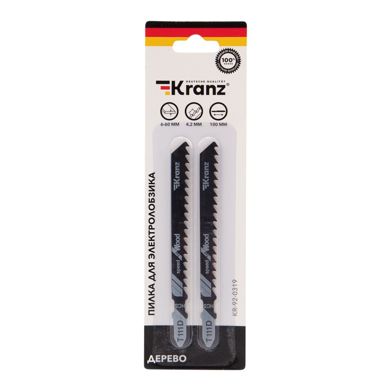 Пилка для электролобзика по дереву T111D 100 мм 6 зубьев на дюйм 6-60 мм (2 шт. /уп. ) Kranz