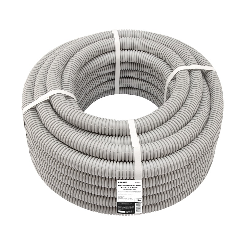 Труба гофрированная из ПВХ с зондом, черная Ø 40 мм (бухта 15 м/уп.) REXANT. Гофрированные трубы (гофра) из ПВХ – профессиональная кабеленесущая система для скрытой/открытой электропроводки в стенах (по стенам), потолках (по потолкам), полах жилых, административных и промышленных помещений.