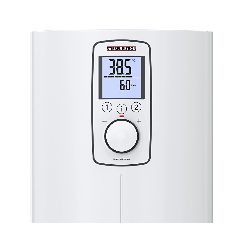 Электрический водонагреватель Stiebel Eltron DCE-X имеет белый корпус с размерами 372х217х109 мм без острых углов. На корпусе расположен функциональный дисплей с подсветкой, поворотный регулятор и кнопки управления для настройки всех необходимых параметров, включая записи температурных режимов в память, установки часов, активации функций контрастного душа, автоматического наполнения ванны и другие. Снизу имеется два разъема для подключения холодного водоснабжения и выход для раздачи нагретой воды. Подключение осуществляется с помощью стандартных подводок G 1/2 A. Внутри аппарата установлен нагревательный элемент, представляющий собой спираль, проходя через которую холодная вода нагревается до нужной температуры. В случае со Stiebel Eltron DCE-X 6/8 Premium она устанавливается пользователем с помощью электронного регулятора или путем выбора одной из двух доступных записанных программ. Купить водонагреватель электрический проточный Stiebel Eltron DCE-X 6/8 Premium можно в интернет-магазине santehstroy.group по самой выгодней цене с доставкой.