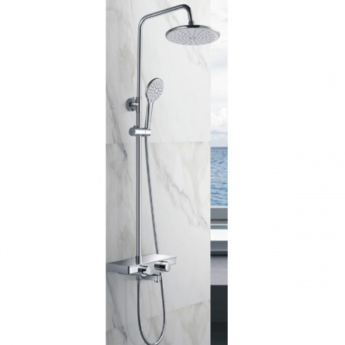В комплекте 1- режимная душевая лейка, 1-режимный тропический душ, изготовленный из современной прочной пластмассы с никель-хромированным покрытием, душевая штанга, держатель душевой лейки поворотный, душевой шланг с латунными гайками 150см, смеситель, индивидуальный пакет, паспорт, гарантийный талон.