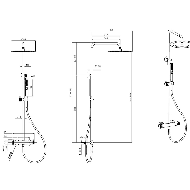 - Диаметр верхнего душа: 300 мм.