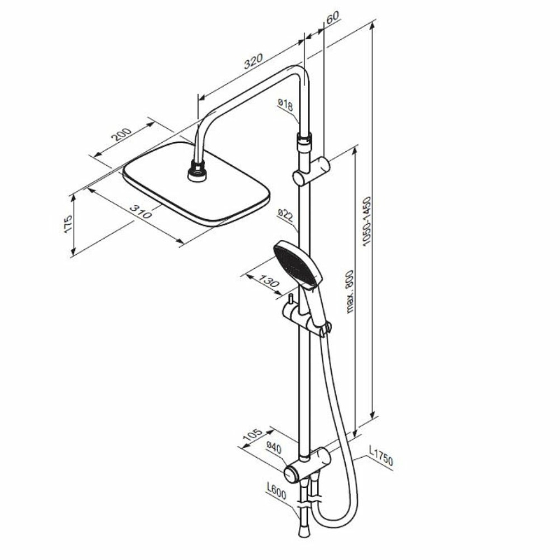 - Монолитный душевой шланг длиной 1750 мм, 600 мм.