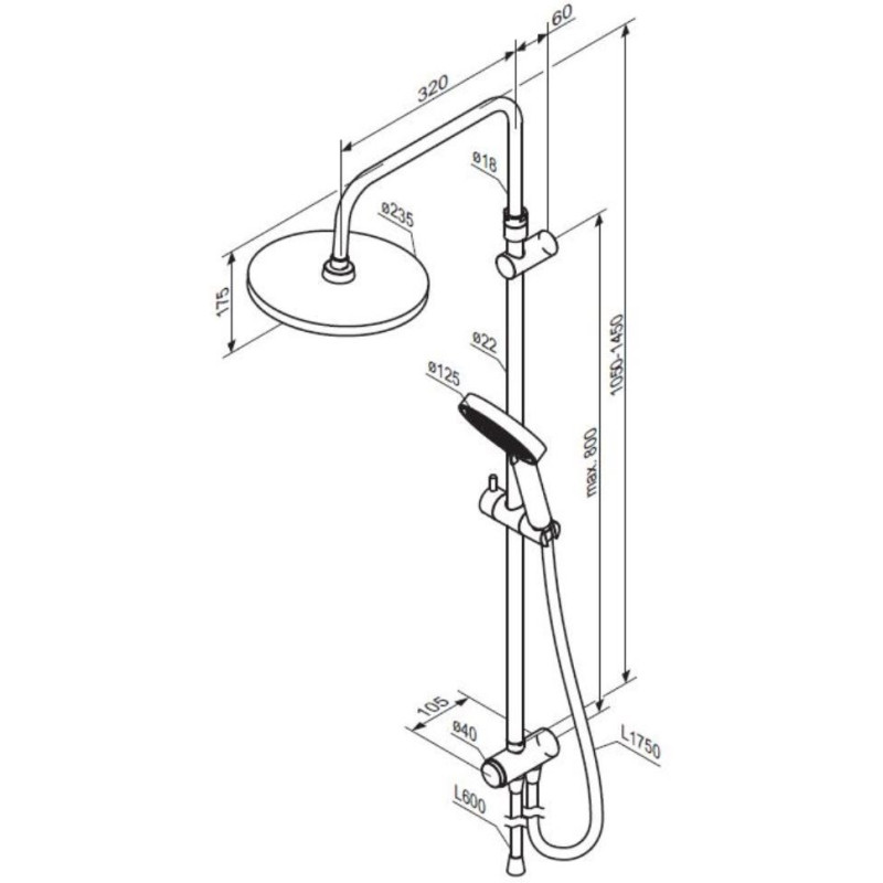 - Монолитный душевой шланг длиной 1750 мм, 600 мм.