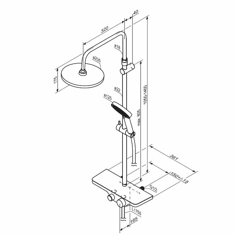 - Высота душевой штанги: 1050-1450 мм.
